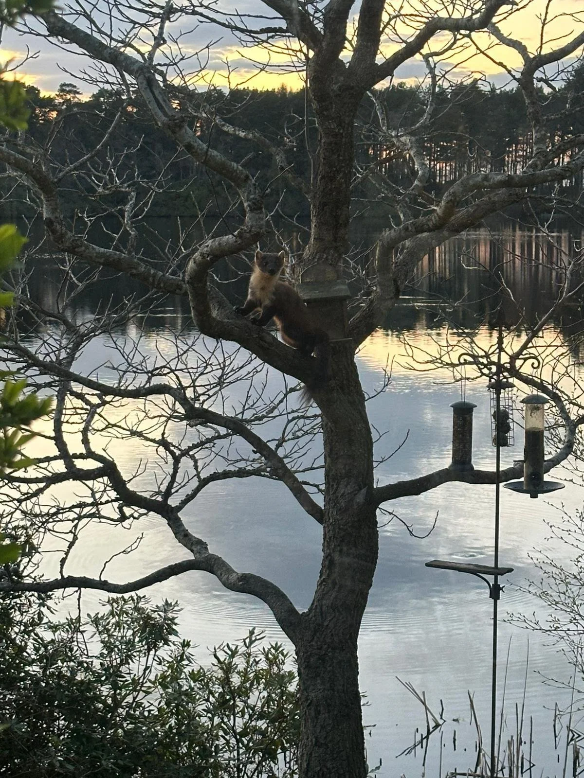 The surrounding woodlands provide cover and food for a wide mix of species. Red squirrels are a regular sight, leaping through the canopy or pausing to feed on cones, while roe deer graze quietly along the edges at dawn and dusk. More elusive residents include pine martens, foxes, badgers, and stoats, which are rarely seen but leave signs of their movements. Smaller mammals such as hedgehogs, voles, and rabbits also make use of the woodland floor.